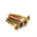 Tornillo para madera, que tiene su terminación cincado dorado. Son utilizados para la fabricación de muebles, stands, escenarios, carpintería de madera, aberturas, viviendas industrializadas, herrajes, construcción modulares. Se aplica también en aglomerados y maderas semiduras.