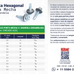 Tornillo autoperforante cabeza hexagonal con punta mecha. En un solo paso perfora y hace la rosca. Ofrece una notable reducción de tiempos de montaje y una mayor resistencia mecánica respecto de otros métodos de fijación. En su proceso productivo recibe un tratamiento térmico de cementado, templado y revenido. El tratamiento anticorrosivo es por medio de cincado electrolítico (deshidrogenado), obteniendo su efecto plateado. Viene ensamblado con arandelas vulcanizadas metal/EPDM, que sirven para la impermeabilización. Se utilizan para la unión de perfiles y piezas metálicas mayores a 1 mm de espesor; en steel framing o construcción en seco; grandes estructuras metálicas o industriales como edificios; también en carrocerías, etc. Vienen en cajas por unidades, y su cantidad depende de la medida del tornillo.