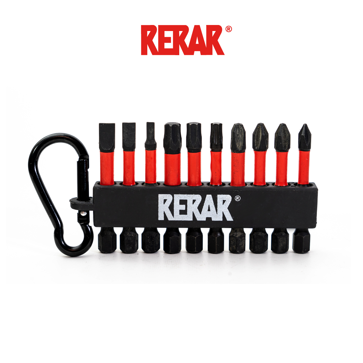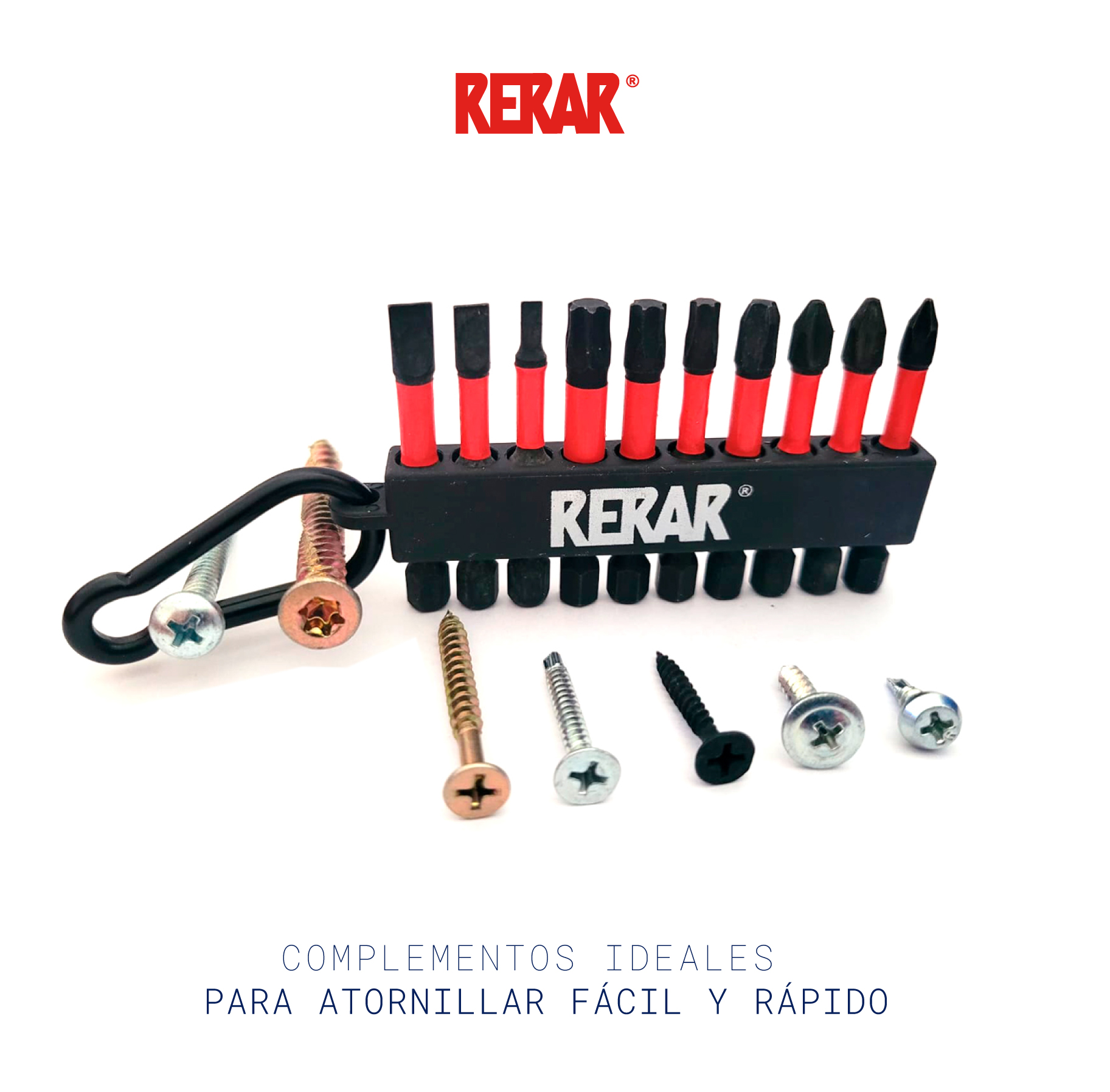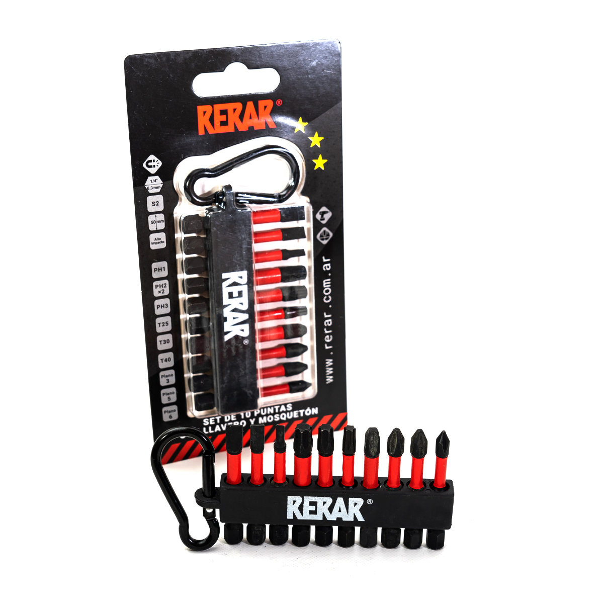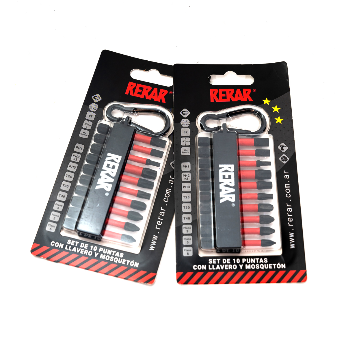 Mosquetón con 10 tipos de puntas de alto impacto de acero S2. Este tipo de acero ofrece resistencia y dureza Rockwell de 55-58 HCR brindando excelente funcionalidad bajo tensión. Este complemento es ideal porque se adapta a varios tipos de tornillos, según el trabajo o proyecto que esté desarrollando. Las puntas al ser imantadas, facilitan la colocación del encastre entre la punta y la cabeza del tornillo, evitando que se caiga y logrando mayor precisión en la colocación. Además, el llavero mosquetón permite que pueda engancharlo de los arnés o cinturones de herramientas, evitando que se pierda.